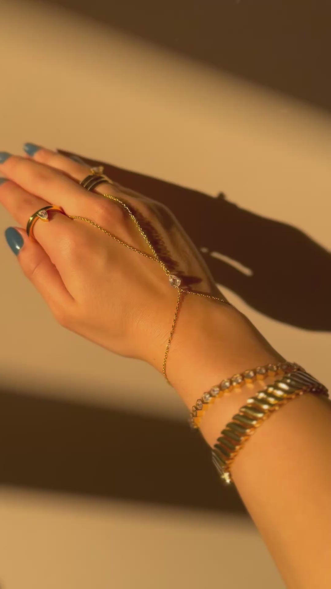 Elegant and subtle, this minimalist hand chain features a slim gold-plated design with a pear-shaped stone at its center. Perfect for casual or formal wear, it’s a refined and dainty accessory.